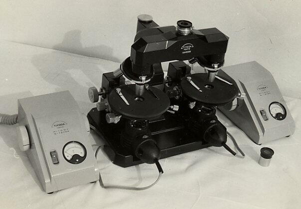 2台の顕微鏡の像が1/2づつ接眼レンズの視野内に見える比較接眼鏡筒を1鏡台に融合